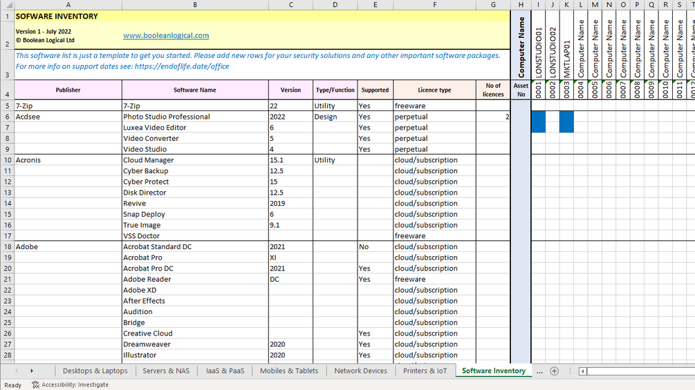 The first two worksheets cover Vendor Management and a Software Inventory to track what each computer has installed, together with additional 6 worksheets covering IT Assets, split into Desktops & Laptops, Servers & NAS, Mobiles & Tablets, Network Devices, Cloud Services, Printers & IoT. For ease each IT asset worksheet is split into the following sections: