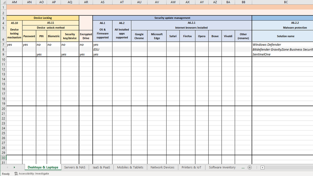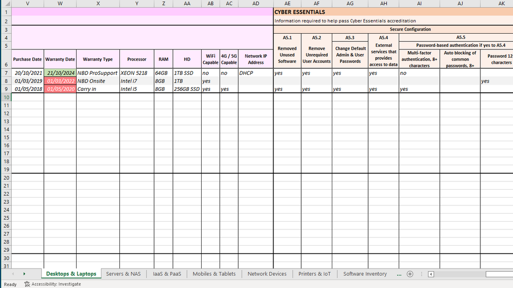 The first two worksheets cover Vendor Management and a Software Inventory to track what each computer has installed, together with additional 6 worksheets covering IT Assets, split into Desktops & Laptops, Servers & NAS, Mobiles & Tablets, Network Devices, Cloud Services, Printers & IoT. For ease each IT asset worksheet is split into the following sections: